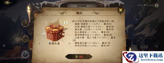 4、玩家可以使用88个“飞艇李”来兑换这个新春礼盒,礼盒中就包含了黑暗粉,不过开启礼盒是概率获得黑暗粉。