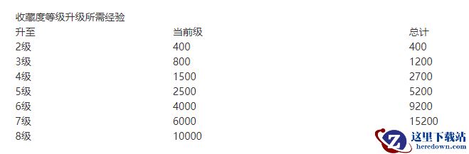 进入正题,明天更新体服上了收藏8,需要10000收藏度,先上收藏度对应收藏值表格: