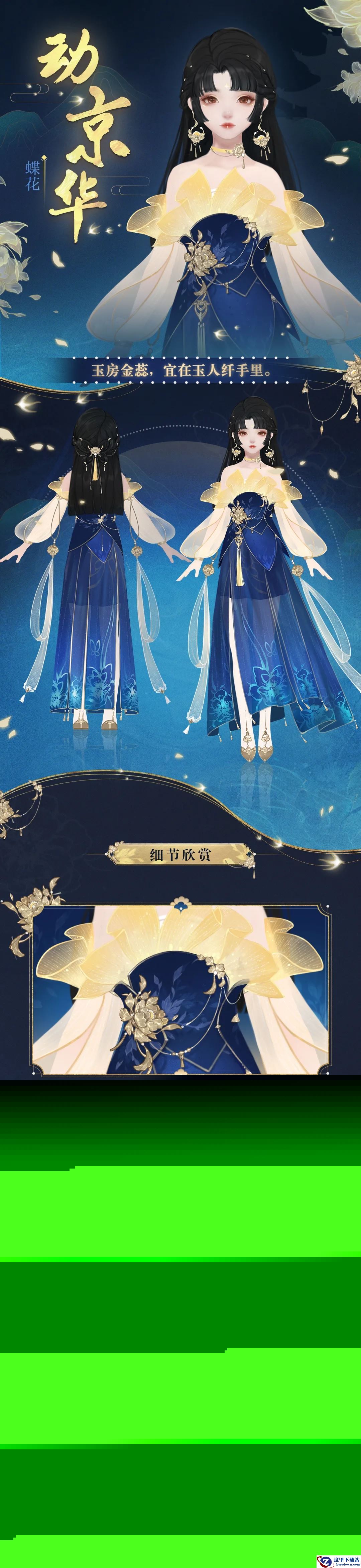 蝶花的长裙以幽蓝色为主体,胸前纱缎鹅黄荷叶边增添了少女的可爱和优雅,腰间精致剪裁如一朵盛放的花朵,纤腰娉婷,如蝶花起舞。