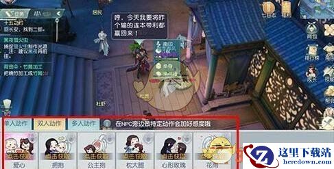 其中单人动作随时都可以使用,而多人动作则是需要玩家组队,玩家还可以给某些NPC进行做动作,从而触发隐藏的一些奖励,玩家可以在这些NPC说出的话中来做出相应的动作。