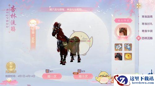 限时开启杏林流觞活动,使用杏花笺可获得高级坐骑马“九韶·玄殷”、“望燎”、云裳画卷、杏花珍酿等物品。
