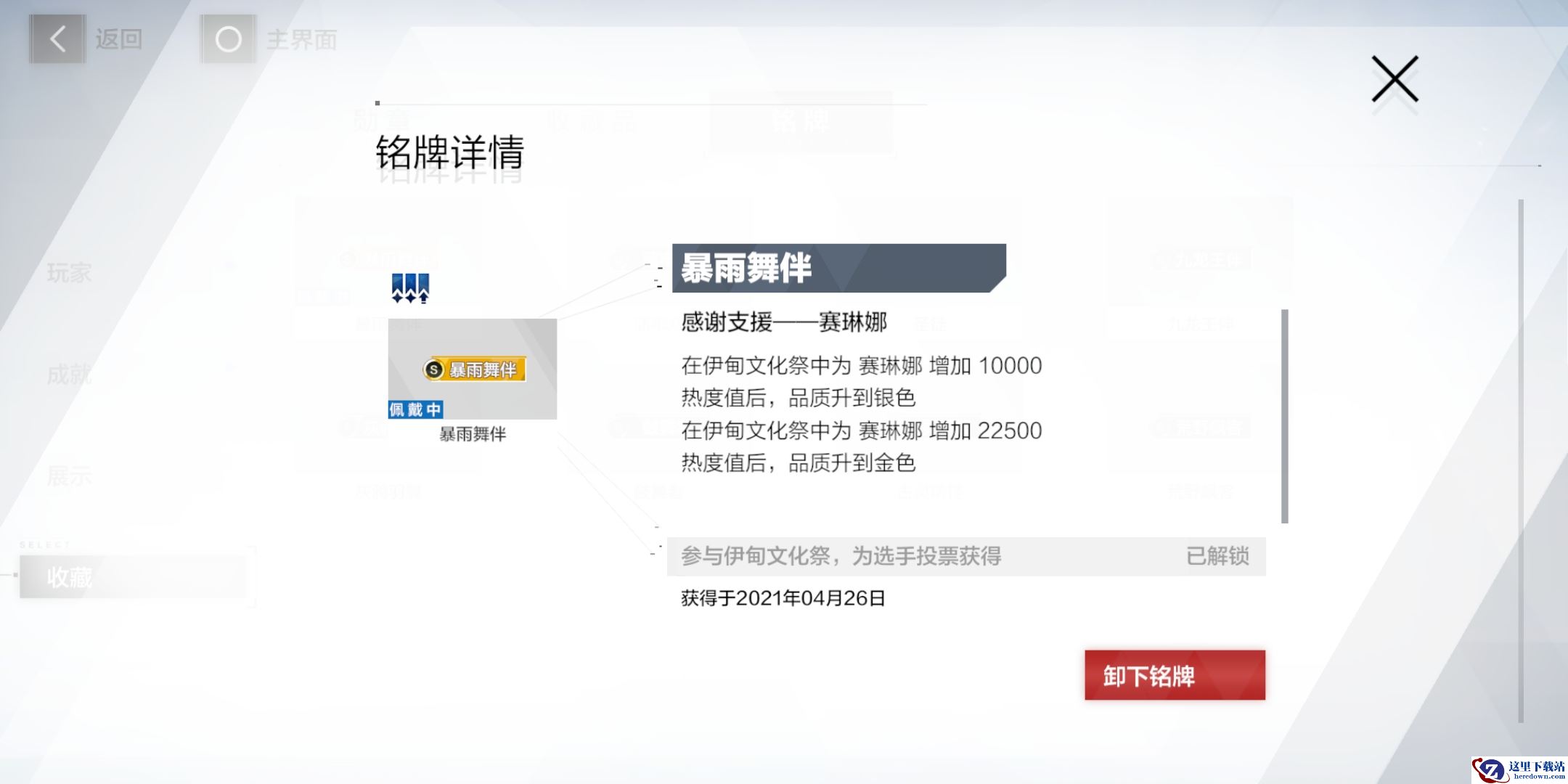 初始获得的铭牌仅为最低品质,以暴雨舞伴铭牌为例,要想升级铭牌,玩家必须在文化纪活动中继续给赛琳娜投票,达到1万点热度值时铭牌将升为银色;达到2.25万热度值将升到金色。