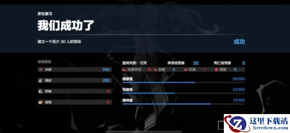 营地人口数>30人保持一个回合(即:会消耗一次药品和食物)
