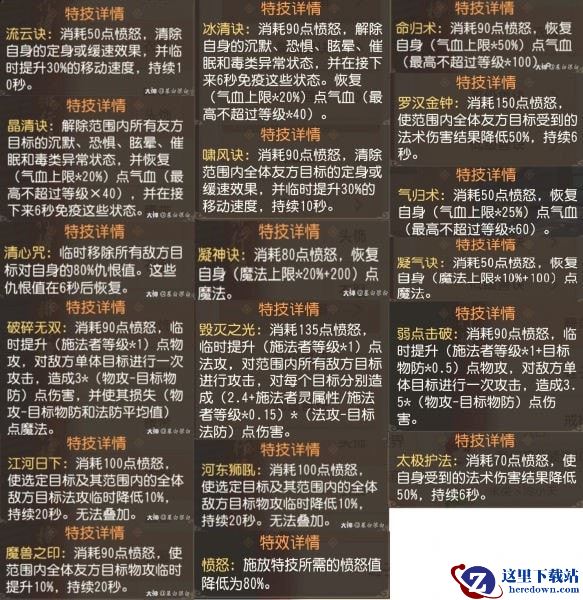特技释放后要冷却6秒才能再次释放特技,不同的特技消耗不同的愤怒值,而愤怒值在战斗中每6秒回复一点,脱战后只能保留70点,愤怒也可以通过特定法宝和药品来即时恢复。