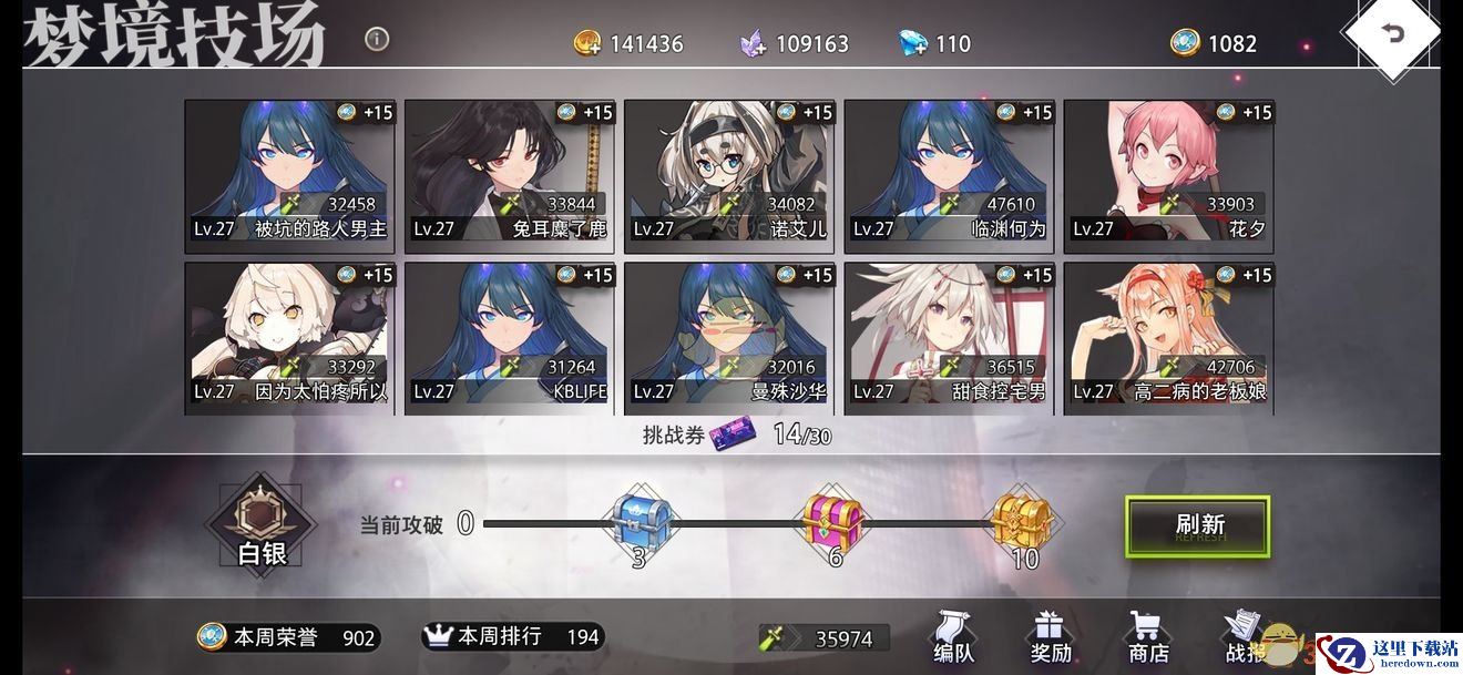 带有计算胜场的排名机制的竞技场(前期可能有些人机后面基本都是真人了)每次挑战消耗一张挑战券,每次刷新会出现十名对手。分别击败3,6,10人时会获得相应的奖励。(挑战卷最大储存上限为30)