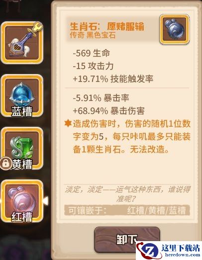 但需要注意的是,如果黑生肖扣除生命较多,可能会导致米娅在进入战斗时就处于死亡状态!图中米娅所带的-569生命的黑生肖,在我给武器和魔法之心都打上生命词条后才保证了米娅的存活,总共用了594+235+250=1079才将米娅从死亡线上拉回来,因此扣除生命较多的黑生肖是不建议大家使用的。