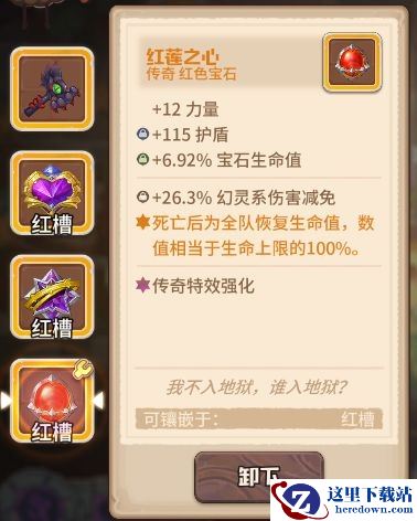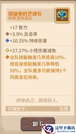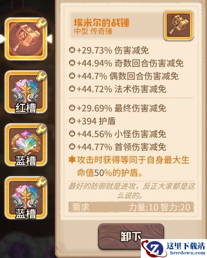 技能强化后的安迪每回合护盾可保留至下一回合,并且在护盾存在时减伤效果提升150%,因此拥有极好的抗伤效果,配合埃米尔的战锤在每次攻击时可以获得等同于自身最大生命值50%的护盾,打上伤害减免的词条,基本上可以算是最肉的咔叽了。宝石选择增加生命的传奇宝石,配合武器的特效,这里选择了三个多彩宝石,词条打上生命和伤害减免,但需要注意其中一个多彩宝石应烙印上至少4点的智力。