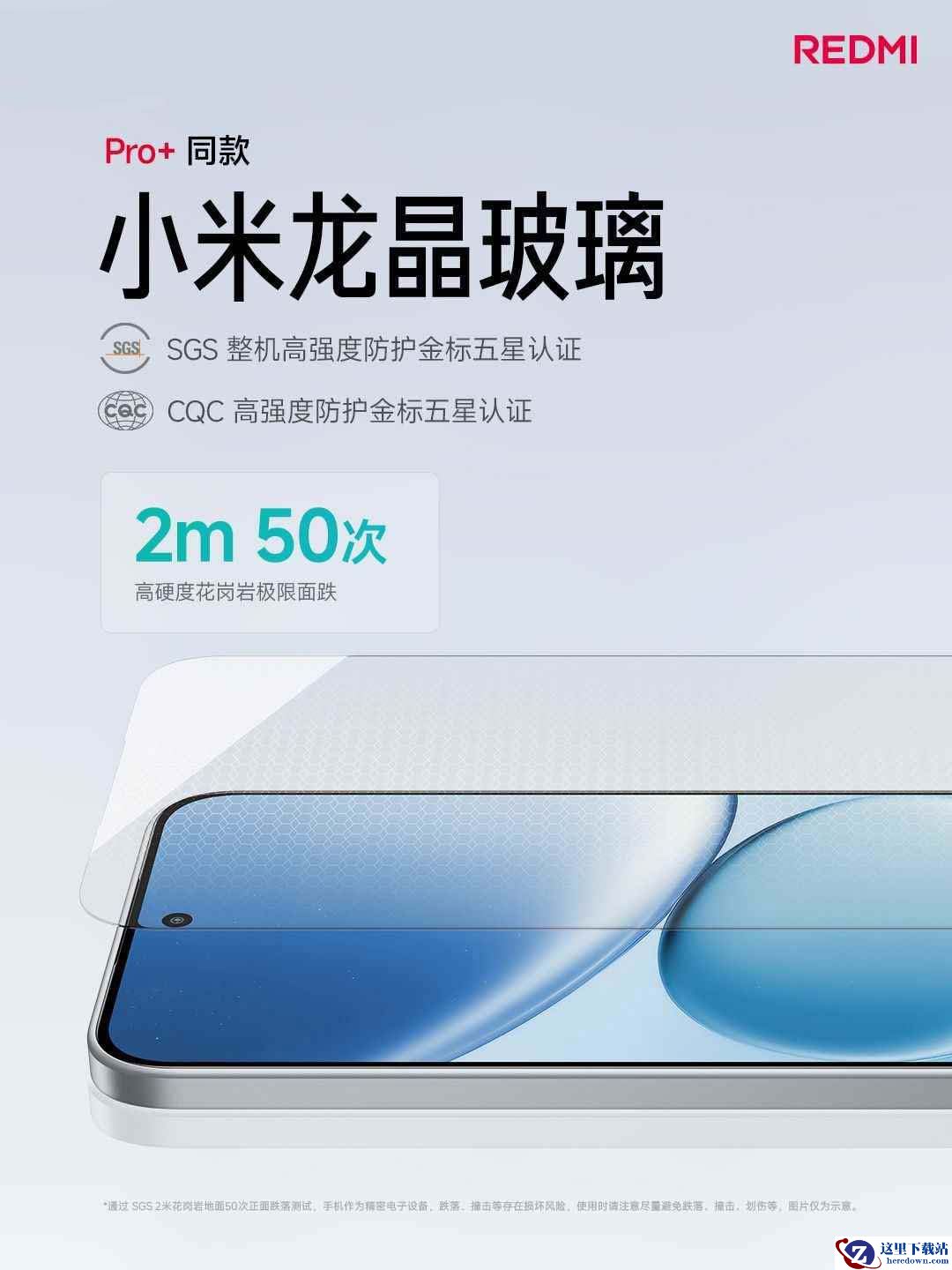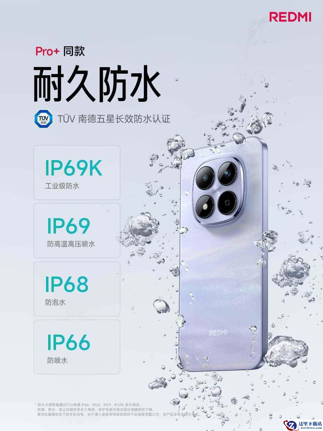 Note 15 Pro搭载Pro+同款小米龙晶玻璃,通过2米50次花岗岩反复跌落测试,支持IP66/IP68/IP69/IP69K防尘防水,通过行业首个五星长效防水品质认证。