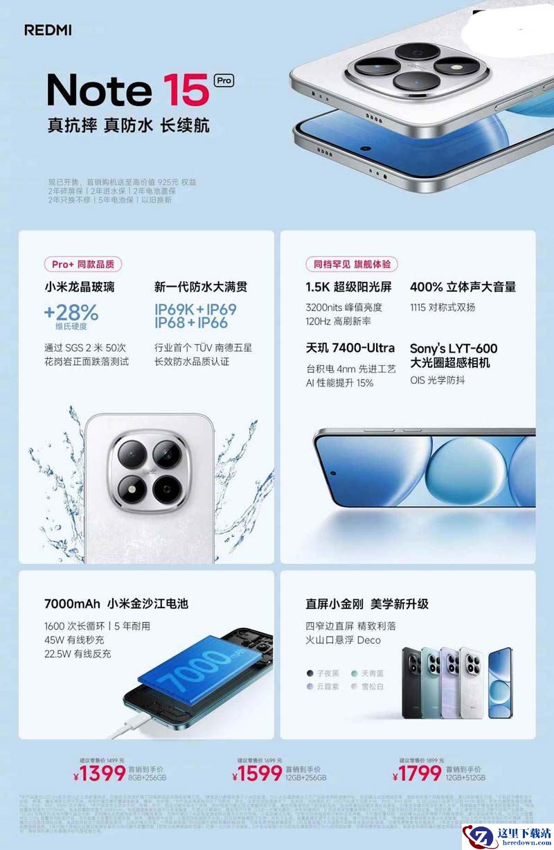 今日,REDMI Note 15 Pro发布,首销价1399元起。Note 15 Pro看齐Pro+同款品质,包括耐摔、防水、长续航、大音量等。