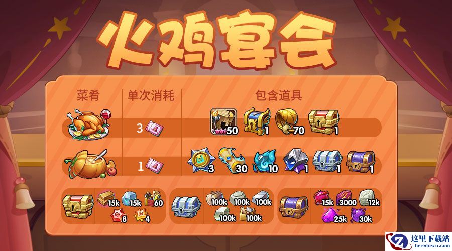 3.感恩节活动期间,使用宴会入场券可以在火鸡宴会中品尝菜品,每次品尝都将随机获得一份奖励哦!若随机奖励获得了感恩大礼包/家园礼包/材料礼包,则可从礼包中的道具任选其一。