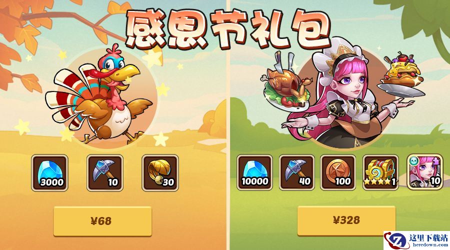 1.活动期间,两种感恩节礼包可供购买。其中328档礼包中包含了四系豪华5星英雄自选箱(内含四系所有初始5星英雄),以及安娜贝拉感恩节限定皮肤:魔法女仆-凤梨,皮肤属性(初始~满级):减伤率4%~5%,生命值5%~8%,速度4~6。