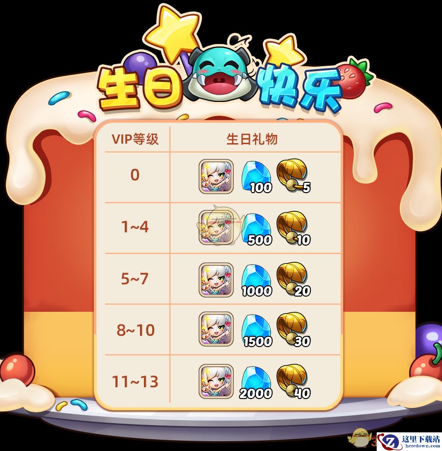 生日礼物以触发生日功能时的VIP等级为准,若生日当天变更VIP则生日礼物不变;