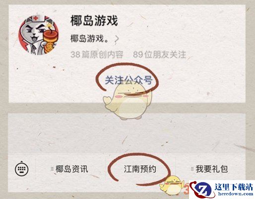 1、在微信中搜索【椰岛游戏】公众号,在对话框中点击【江南预约】,就能进入预约活动界面。