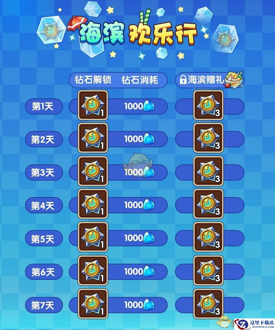 在海滨欢乐行活动中,会每天解锁一份礼物——1个时空核心,每份礼物需消耗1000钻石。同样,如果付费解锁额外购买项,还可解锁海滨欢乐行的额外奖励!