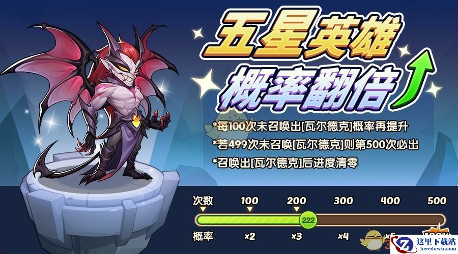活动期间,召唤五星英雄概率翻倍,有更高的几率召唤到深渊新英雄——瓦尔德克。