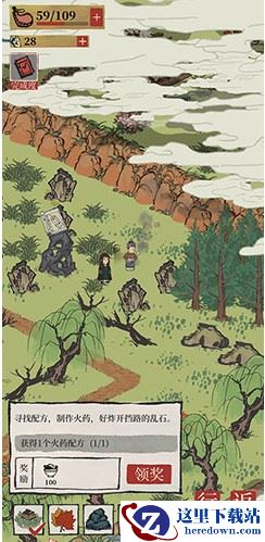 玩家需要在地图左下角石头处获取,首先需要制造炸药,炸掉石头后才可以继续前进。