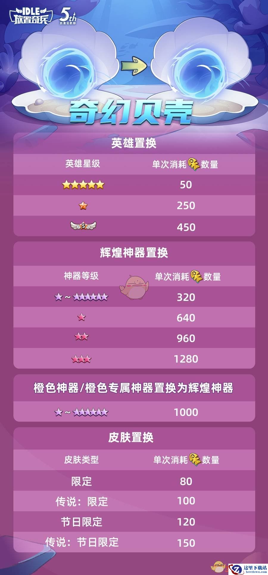活动期间,消耗【五周年纪念章】可将背包中的英雄、皮肤或者神器进行自选置换,详情如图所示。