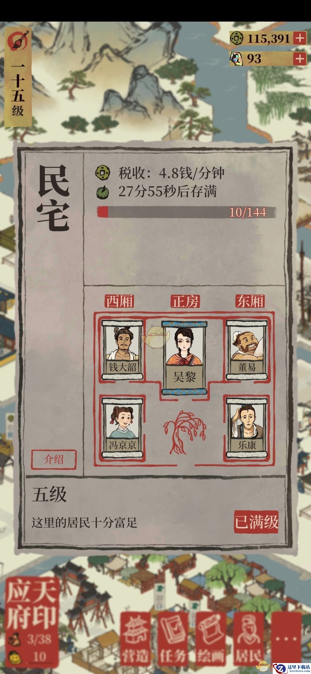 民宅的好处在于,其他水井、画院都是每次要点生产才能出铜钱,而民宅只要你设置税课司,它就会一直自动帮你收铜钱。所以尽可能都升满级。如图5级民宅收入