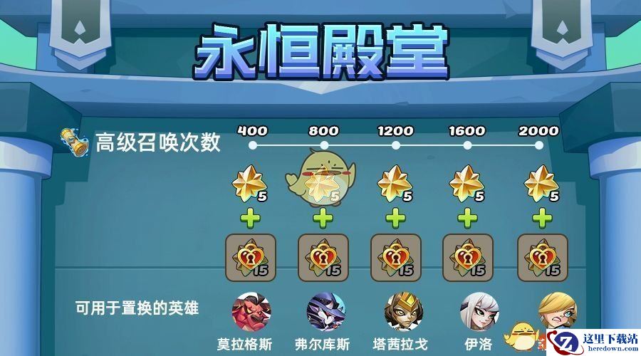 并且在召唤活动期间,当高级召唤达到一定次数,还将获得永恒结晶。使用永恒结晶可将图示五位英雄置换为本次森林新英雄——格洛丽亚。