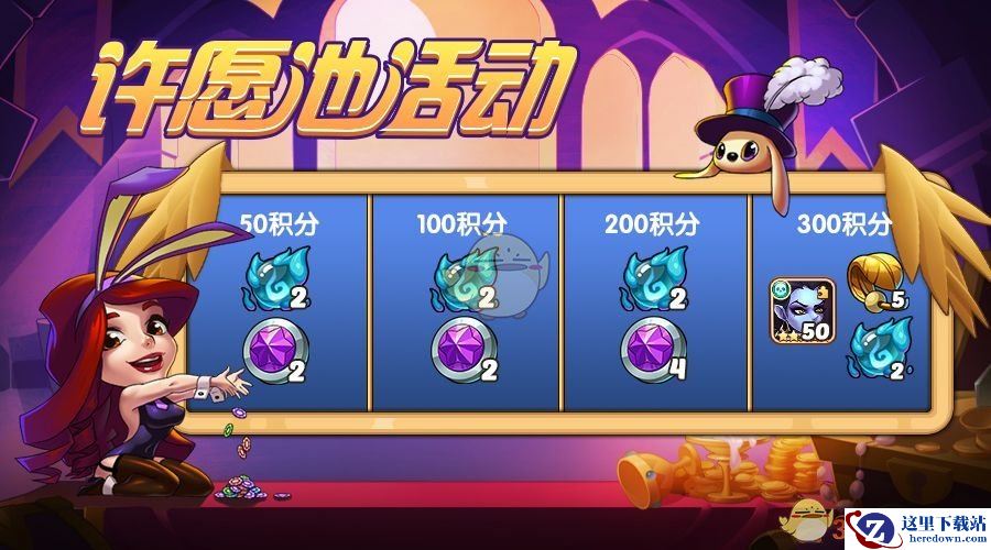 活动期间(2021.04.23 00:00 - 2021.04.29 23:59),在普通许愿池使用许愿币可以获得积分,当积分达到指定数额即可获得对应奖励。300积分的奖励的英雄为幽暗法师——杰赫拉。