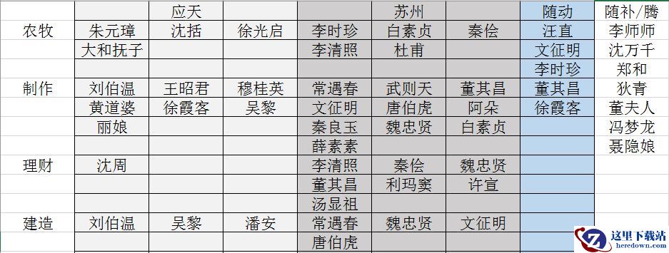 当我有了苏州之后,我就开始画这张表,每得到新的人物,都会重新调整。一开始我没有李时珍,沈括是常驻苏州的,因为苏州适合农牧制作双精的人物(生产草药、丹丸和木炭)。大家千万不要照搬这张表,因为这张表是为了挂机赚钱分配的,如果还没到这个阶段。你得根据你现在的建设目标、生产建筑的数量、人物培养程度来分配。