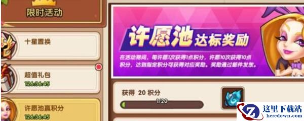 放置奇兵许愿池一般是在限时活动中,点击屏幕右上角的限时活动图标,找到许愿池赢积分活动的图标,可以进行抽奖。许愿池内抽奖一次获得1点积分,达成指定积分可以获得奖励。需要注意的是,许愿池抽奖需要用到许愿币,许愿币需要用到大量钻石去市场购买,获得足够的许愿币之后就可以点击许愿池进行抽奖了(连抽10次可以节省2个许愿币)。