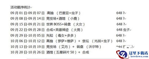放置奇兵每周活动顺序:高抽、竞技场+酒馆、世界Boss+转盘、合成+英雄神迹、先知。放置奇兵的活动顺序都是按顺序轮换的,有时候可能会有俩个前后颠倒,不过整体顺序是不会变的。