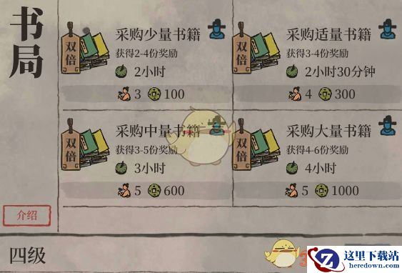 7、书局每天的前2次采购都是双倍奖励。双倍指的是数量翻倍。(比如初始4级随机奖励4-6本书,双倍随机奖励8-12本书)(所有城市累计)