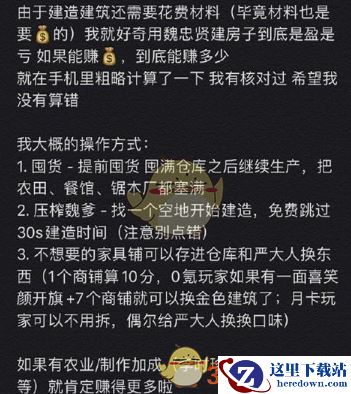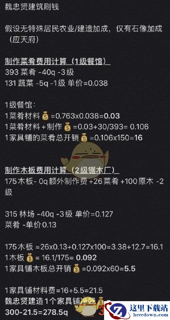 下图第一张是计算过程,建造并拆除一栋家具铺可以盈利278.5铜钱(只有石像加成,没有特殊居民加成的情况下);