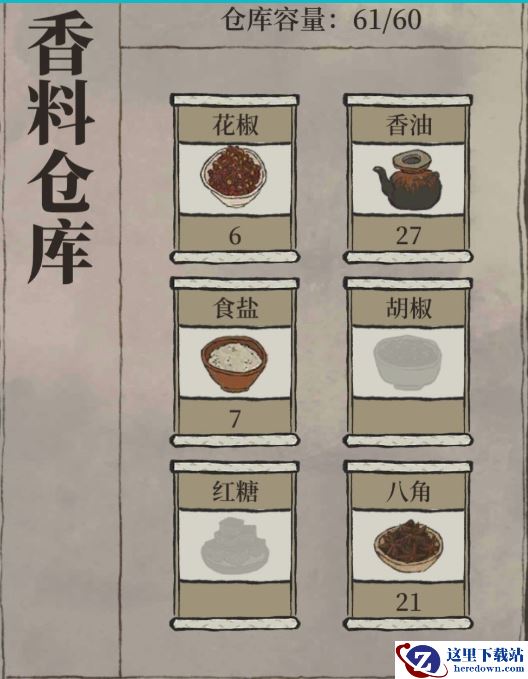 2、我们也可以用好评空盘来提高仓库容量,这个会比较实际一些。(好评空碟:需要去厨房开始做出相应的菜系,做菜也需要花费一些香料,这样香料仓库就有空缺,做菜完成后就可以获取好评空盘。再用好评空盘去提高香料仓库容量!对于平民玩家这是最实际的方法。做菜除了有好评空碟效果外,还可以升级客栈。)
