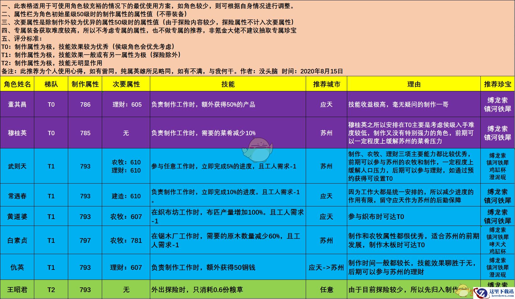 1、此表格适用于可使用角色较充裕的情况下的最优使用方案,如角色较少,则可根据自身情况进行调整。