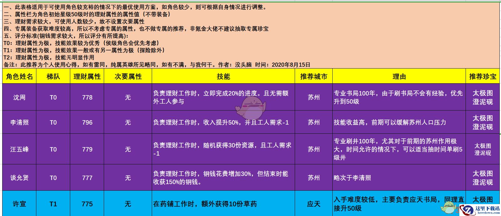 T0:理财属性为极,技能效果较为优秀(侯级角色会优先考虑)