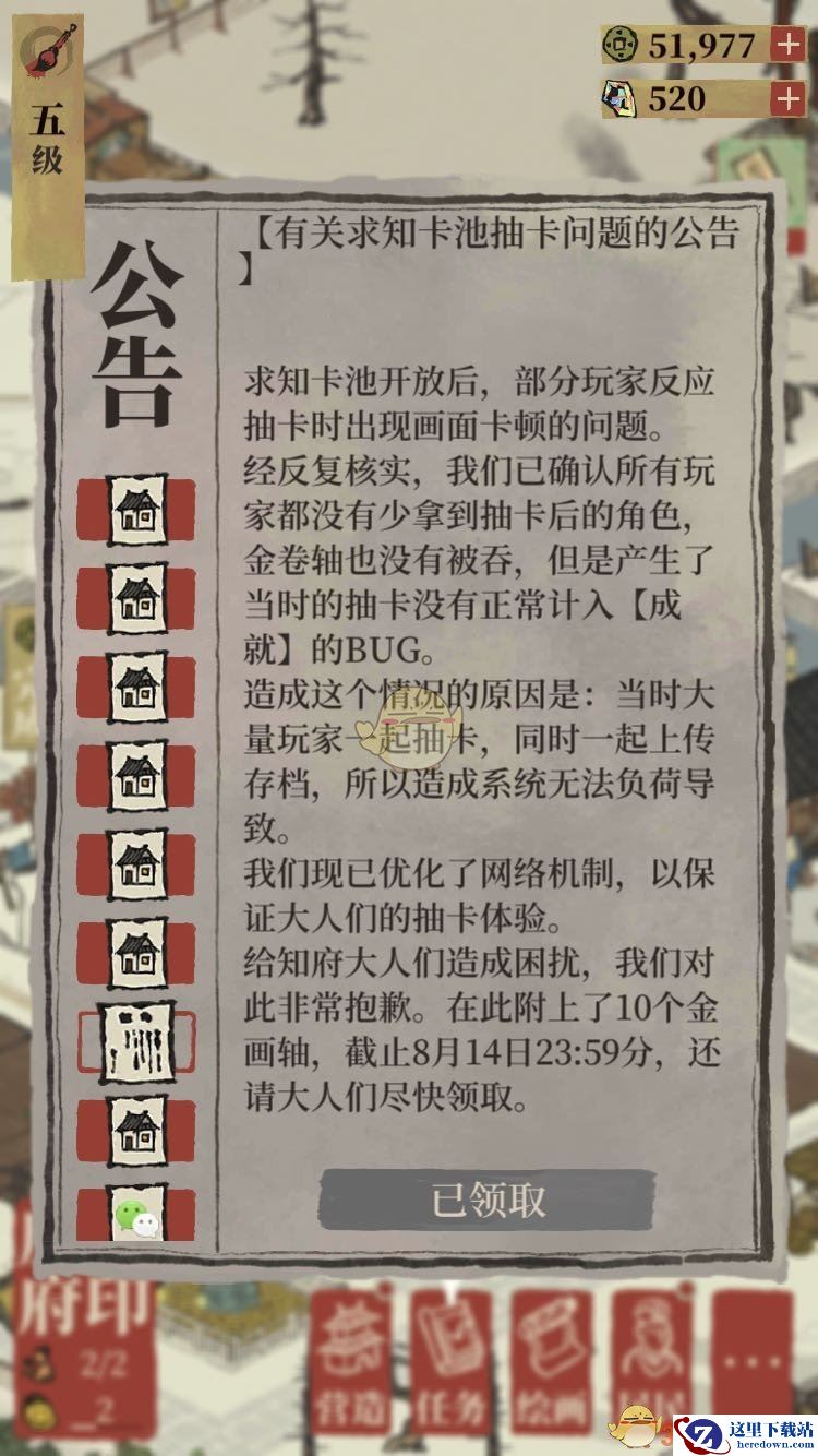 运营团队在州府—查看公告处附上了10个金画轴,截止8月14日23:59分,还请大人们尽快领取。