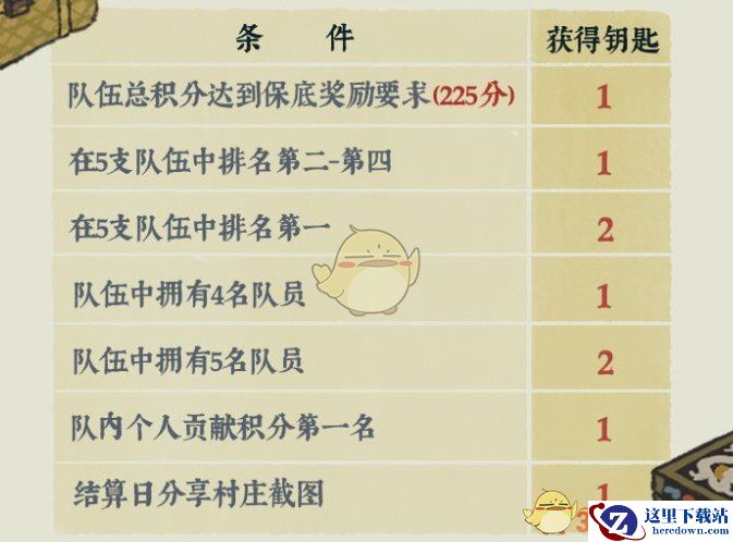 咸鱼队钥匙保底个数:4 (含队伍225保底分,且满五人组队)