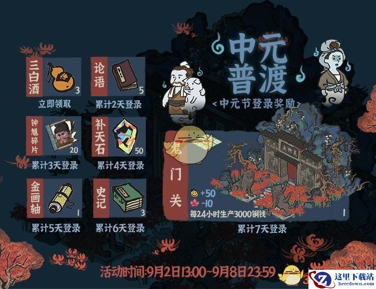 中元节登录奖励开启~累计登陆即可领取金画轴、补天石、三白酒等小礼~