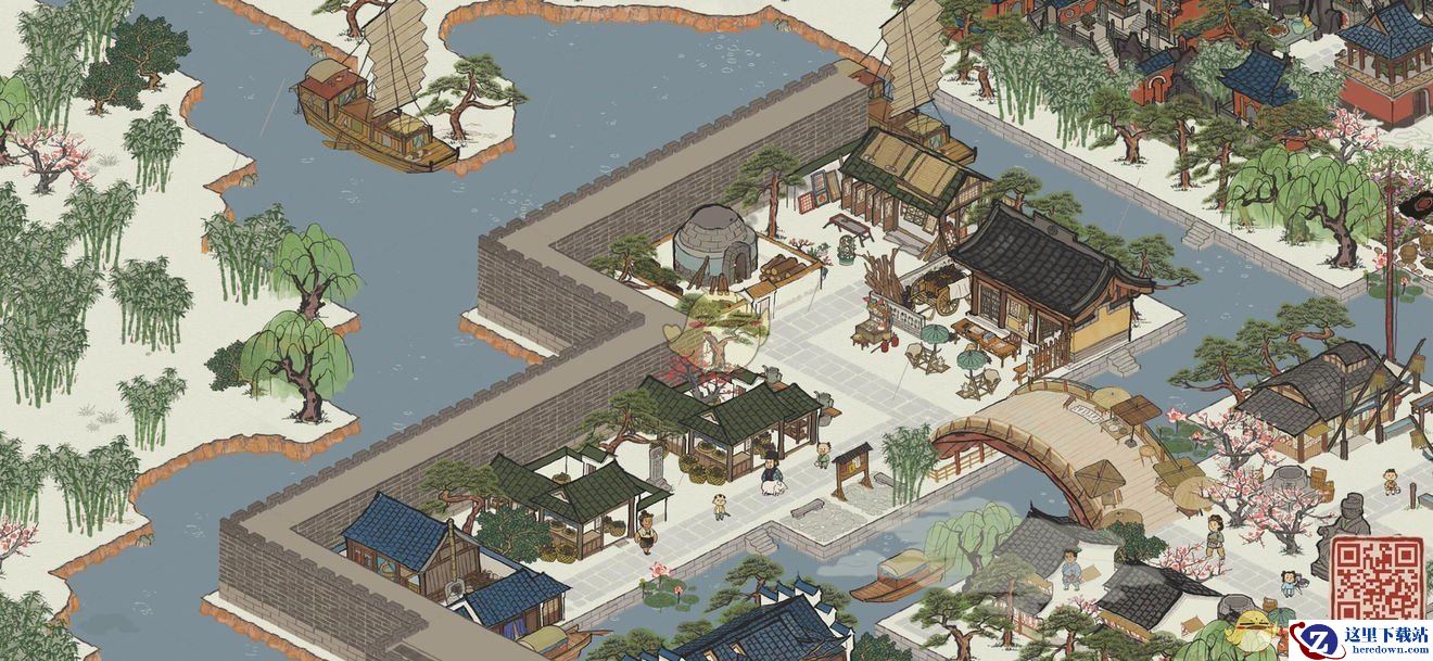 材料:青楼、戏台、浴池、盆栽园、早餐摊、算卦摊、水池、松树、樟树、告示牌。
