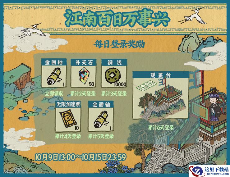活动时间: 10月9日13: 00—10月15日23: 59,根据签到时间,玩家可在10月14日领取观星台。