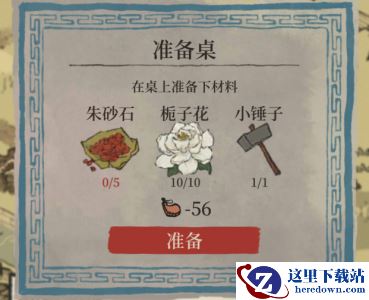 在桌上准备材料,朱砂石*5,栀子花*10,小锤子*1。