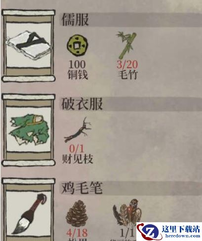 3、玩家在店铺中可以购买儒服、破衣服、鸡毛笔这三个道具。