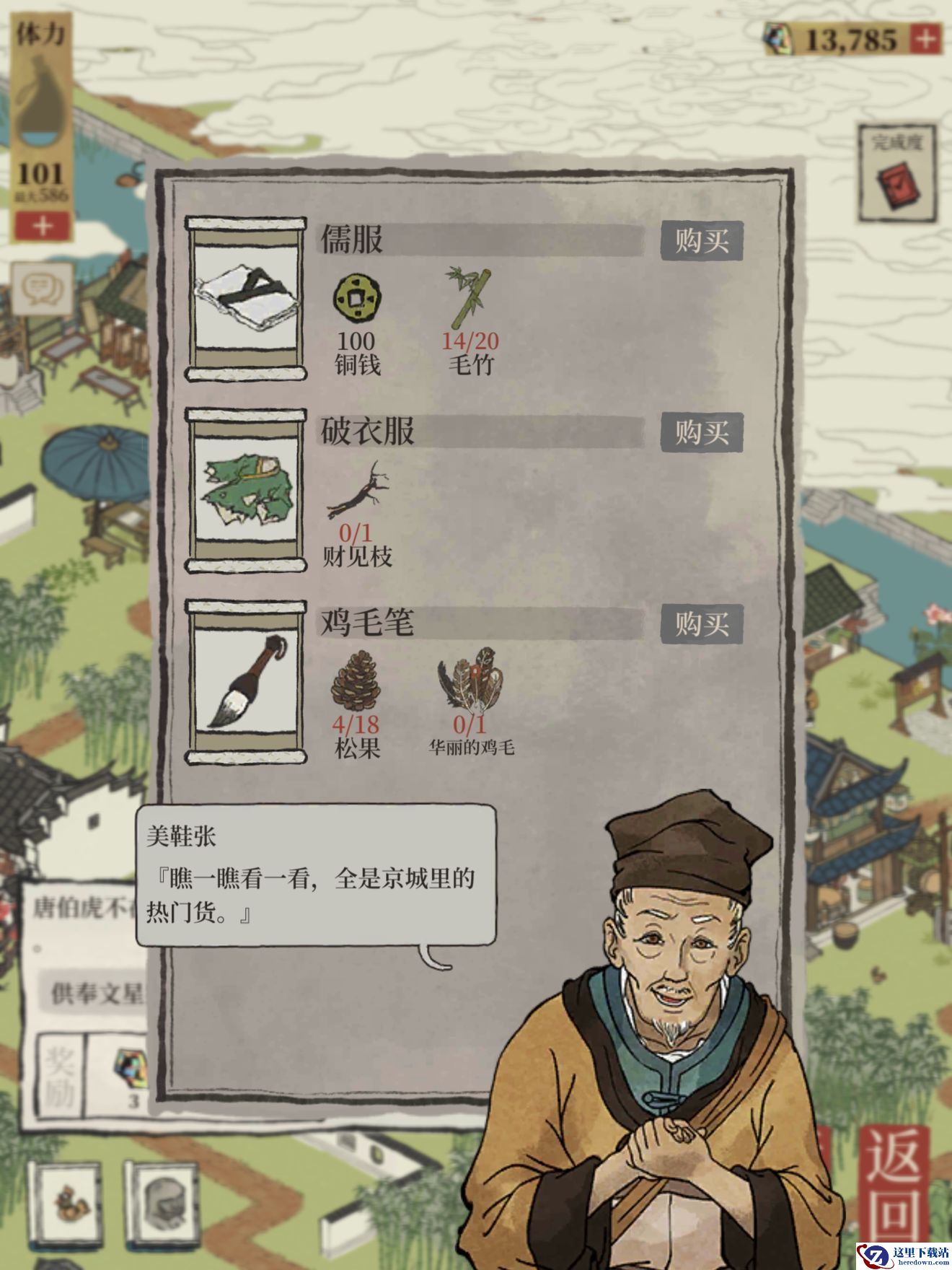 1、儒服:购买需要铜钱*100,毛竹*20。