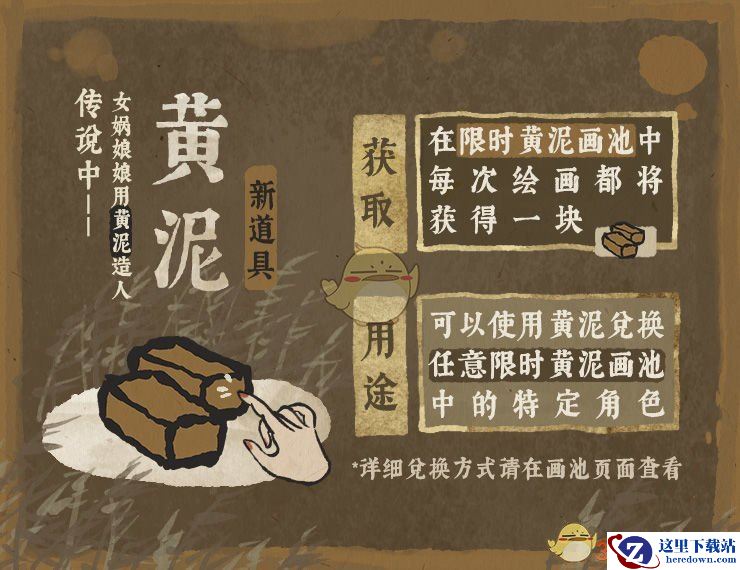 每次在【限时黄泥卡池】中绘画都将获得一块【黄泥】。
