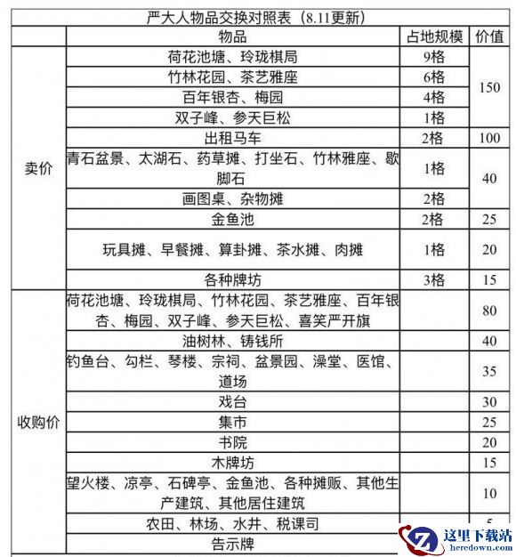 有江湖消息称,严大人在多年的买卖生涯中,形成了自己独有的一套价值交换体系。(以告示牌为例,在严大人的眼中,价值为1,竹林花园价值为150,虽然严大人对于告示牌很是不屑,但如果我们凑够150个告示牌也不是不能商量的)具体见下图。
