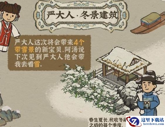2、春生夏长,秋收冬藏,之后的每个季度,严大人都会带主题特色建筑与大人交换。