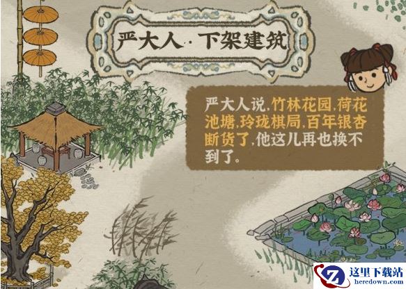 1、严大人说,竹林花园,荷花池塘玲珑棋局,百年银杏断货了,他这儿再也换不到了