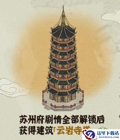 苏州府探险剧情全部解锁后可获得建筑云岩寺塔。