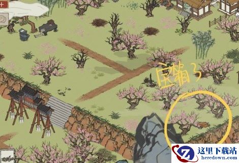 温泉水旁边有一个桃树坑,需要把前面的松树砍了才能过去