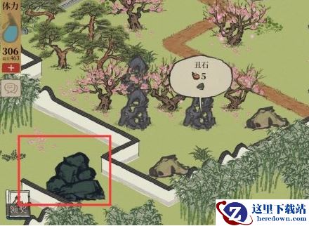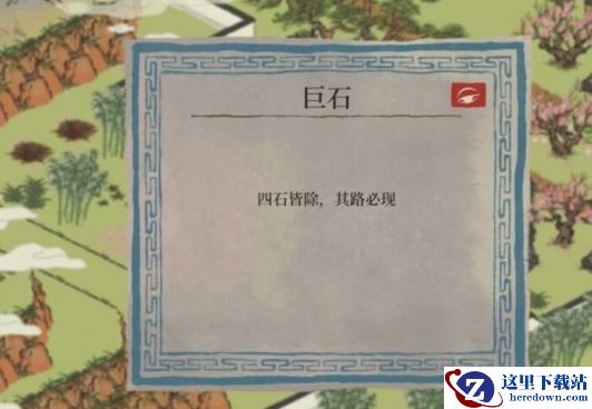 巨石是黑色的大石头,在两个围墙中间,需要砍掉外面的竹子才能进去。