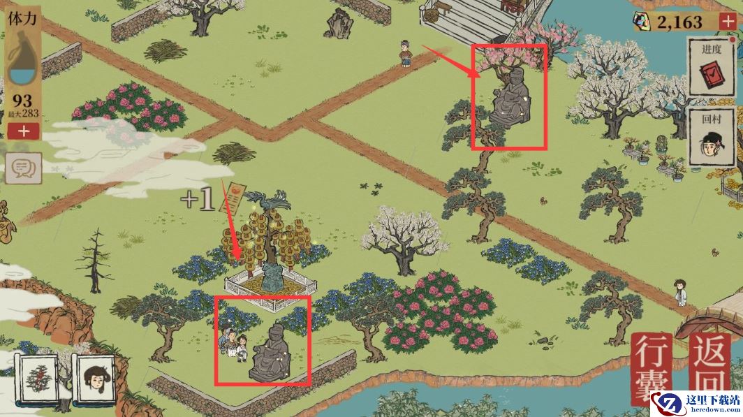 2、把这两个石像修好,就可以解除迷雾,然后在小树林就能找到铲子了。