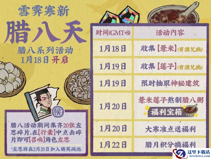 1月18日11:00起,参与“雪霁寒新腊八天”活动即可获得金画轴、补天石、侯级新居民【左思】等福利!