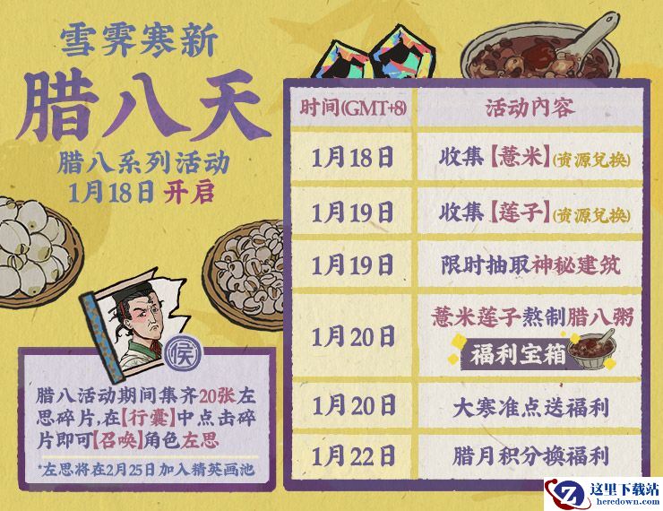 1月20日至1月28日,知府们可将收集好的【莲子】与【薏米】兑换成【腊八粥】,使用【腊八粥】就可以换取相应福利。